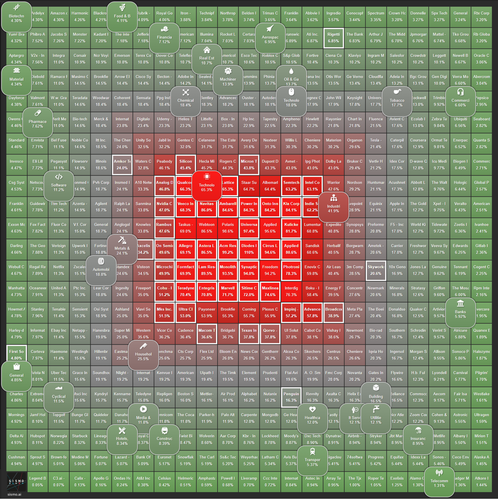 • Colored from red to green according to their relative performance against the S&P 500 over the same period.