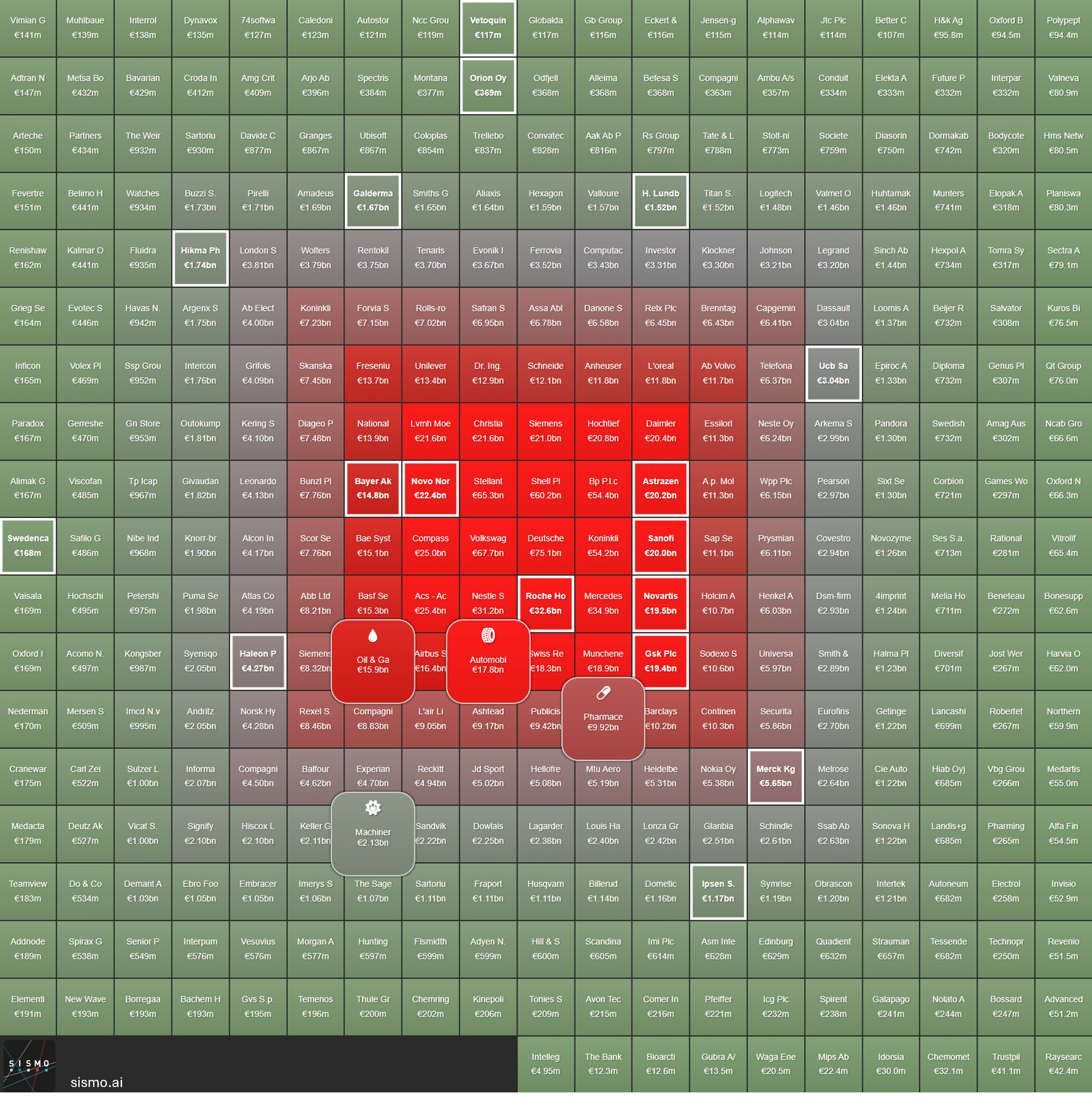 At the very center: Roche, Novo Nordisk, AstraZeneca, Sanofi, Novartis.