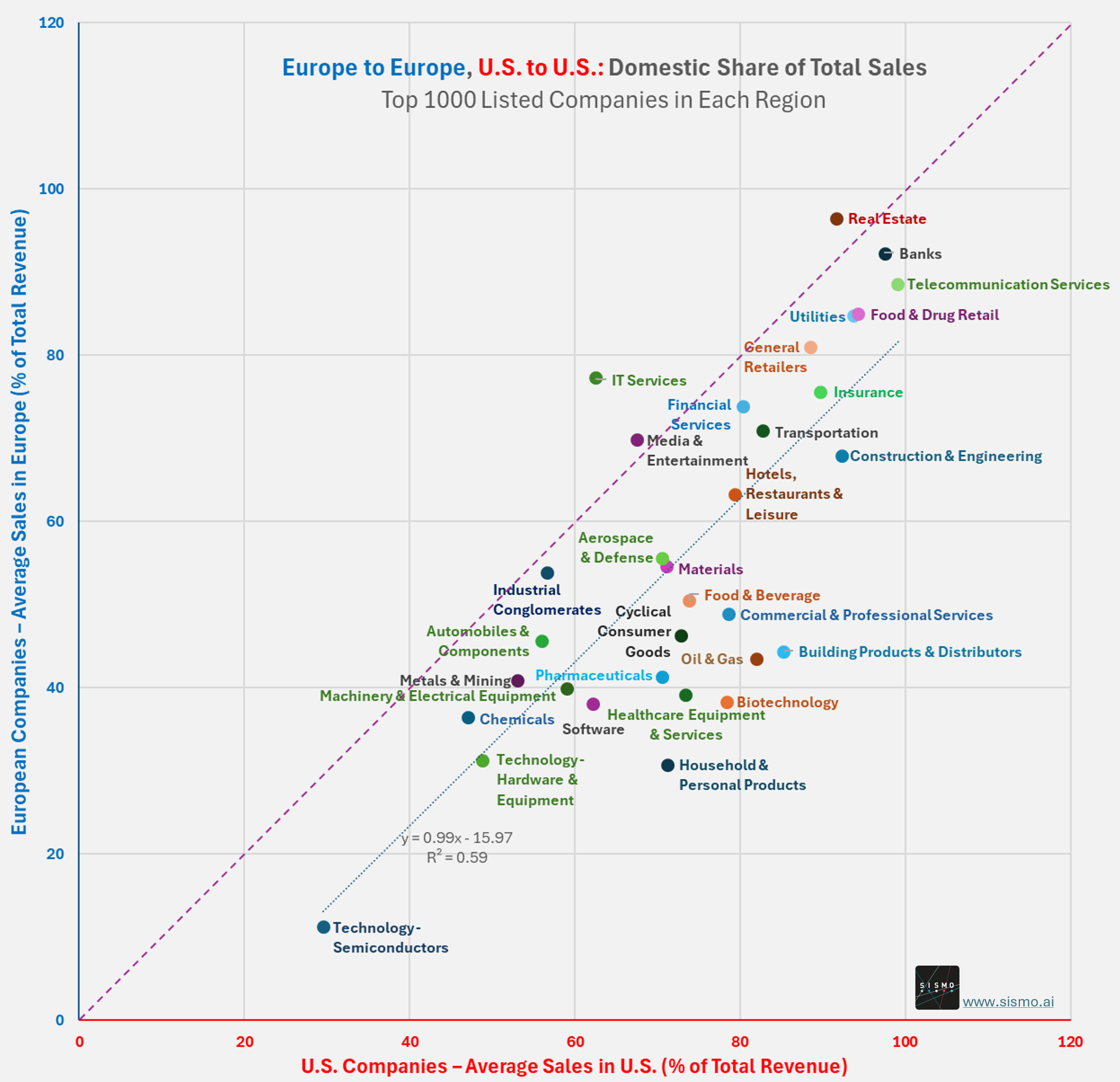 The exception remains semiconductors. Here, U.S. companies generate only 30% of their sales domestically and European peers just 11%, underlining Asia and China’s dominant role in this sector.
