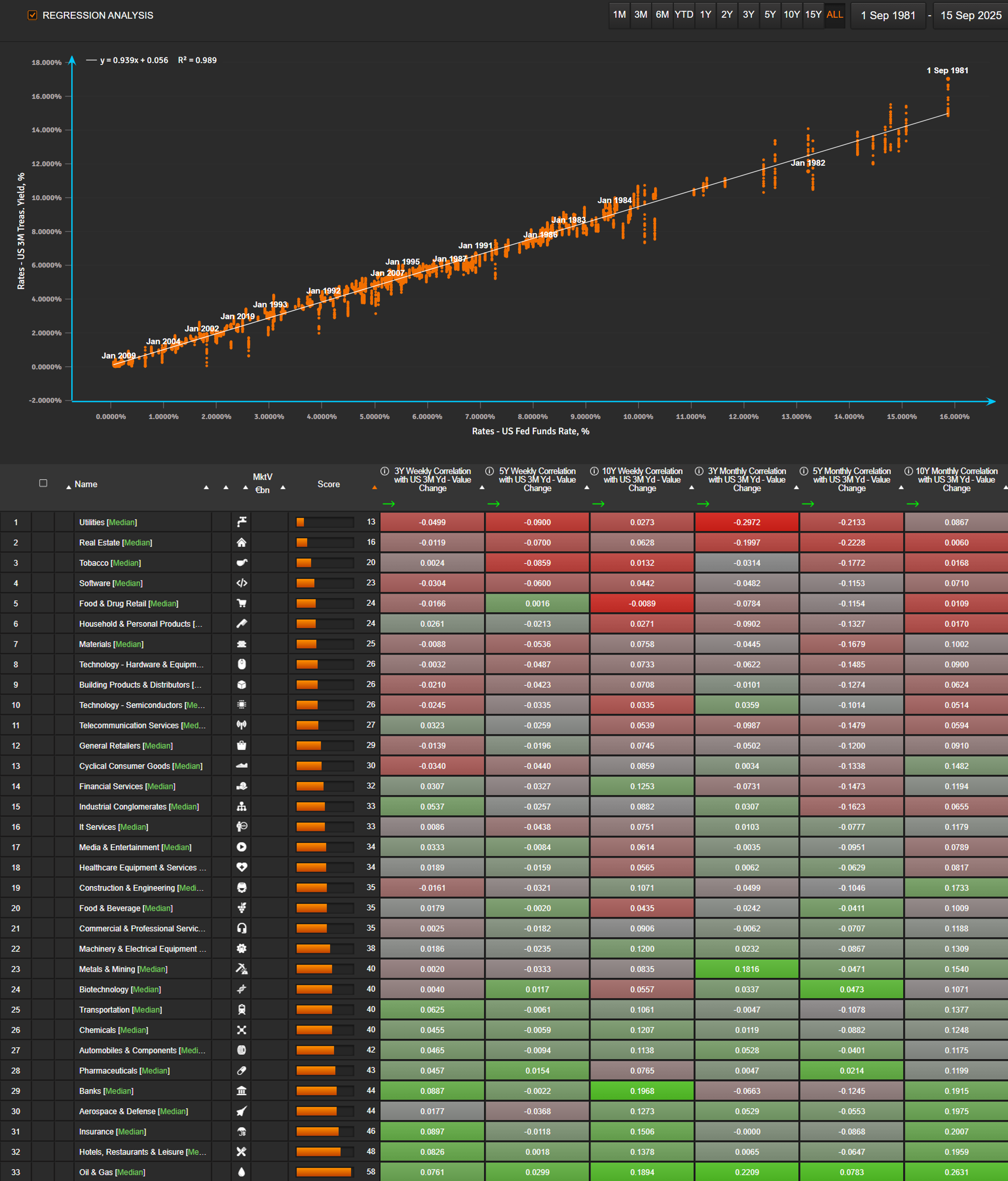 At Sismo, we measure weekly and monthly correlations of Russell 1000 stocks to changes in the 3M yield, across 3-, 5-, and 10-year windows. We then aggregate results at the sector level.