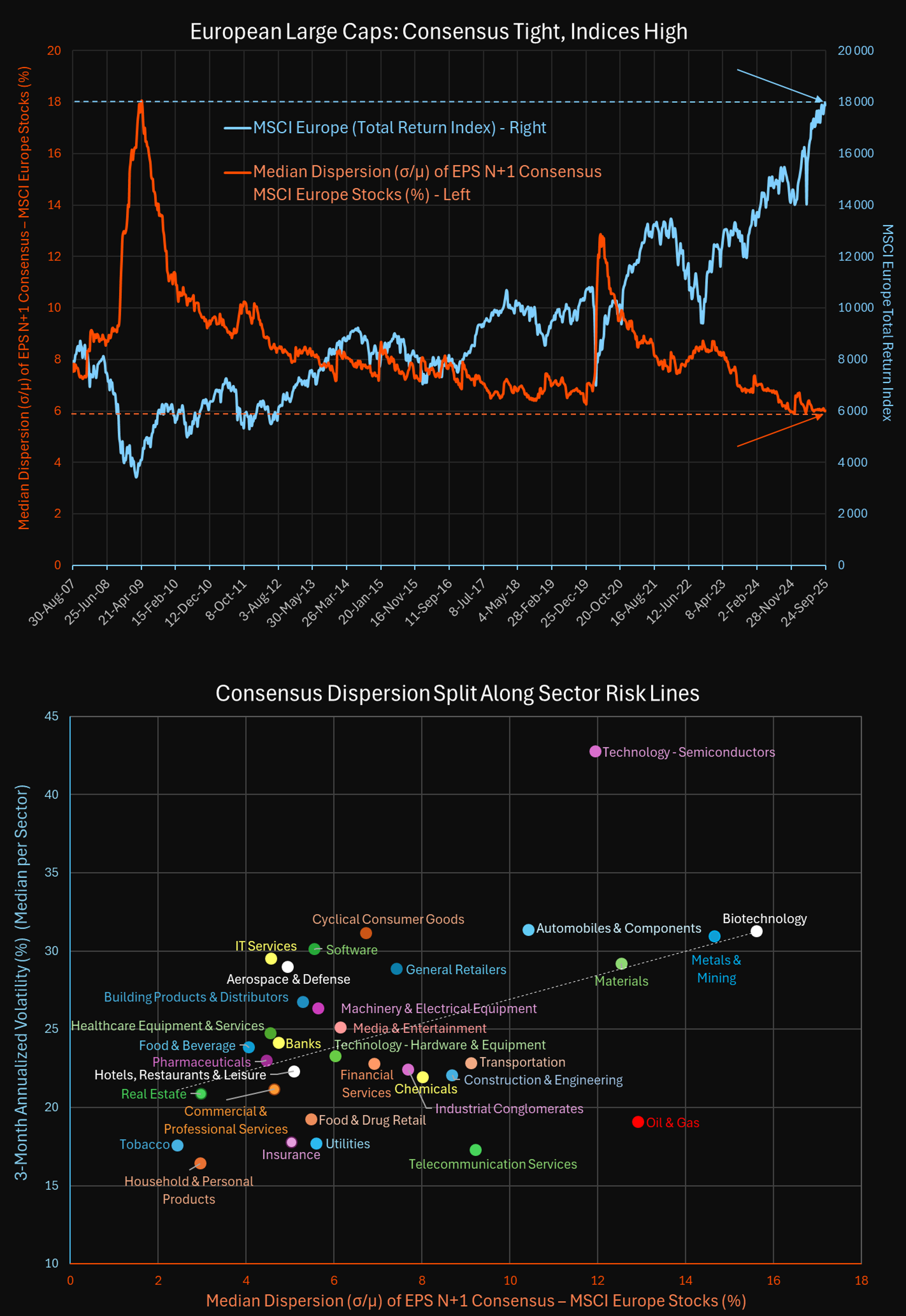 On European large caps (MSCI Europe), the median dispersion of broker forecasts on EPS N+1(σ/μ) has fallen to a record low of ~6%. At the same time, the index is at record highs.