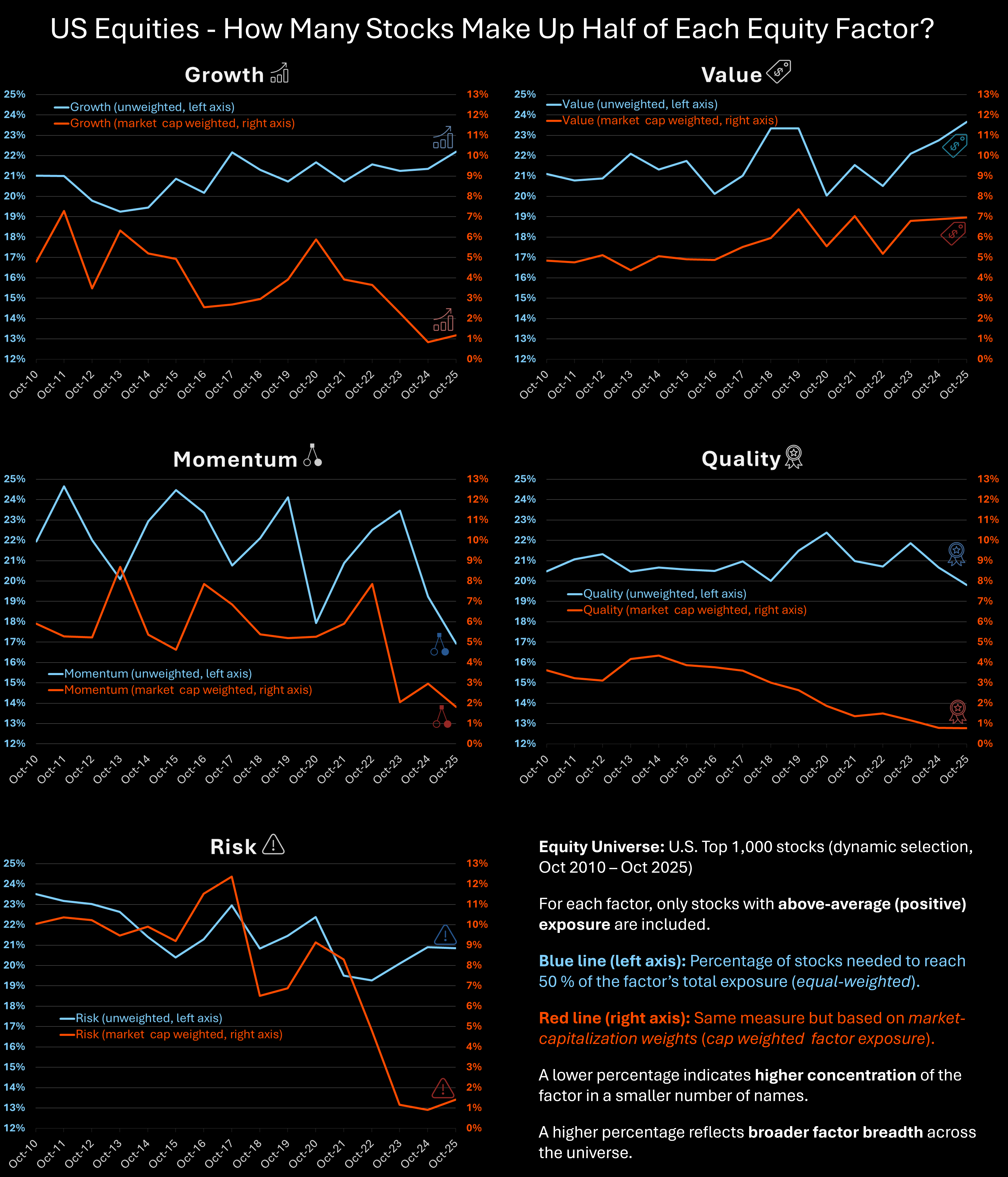 By 2025, four - Growth, Momentum, Quality and Risk - had become much narrower, dominated by the same mega-caps