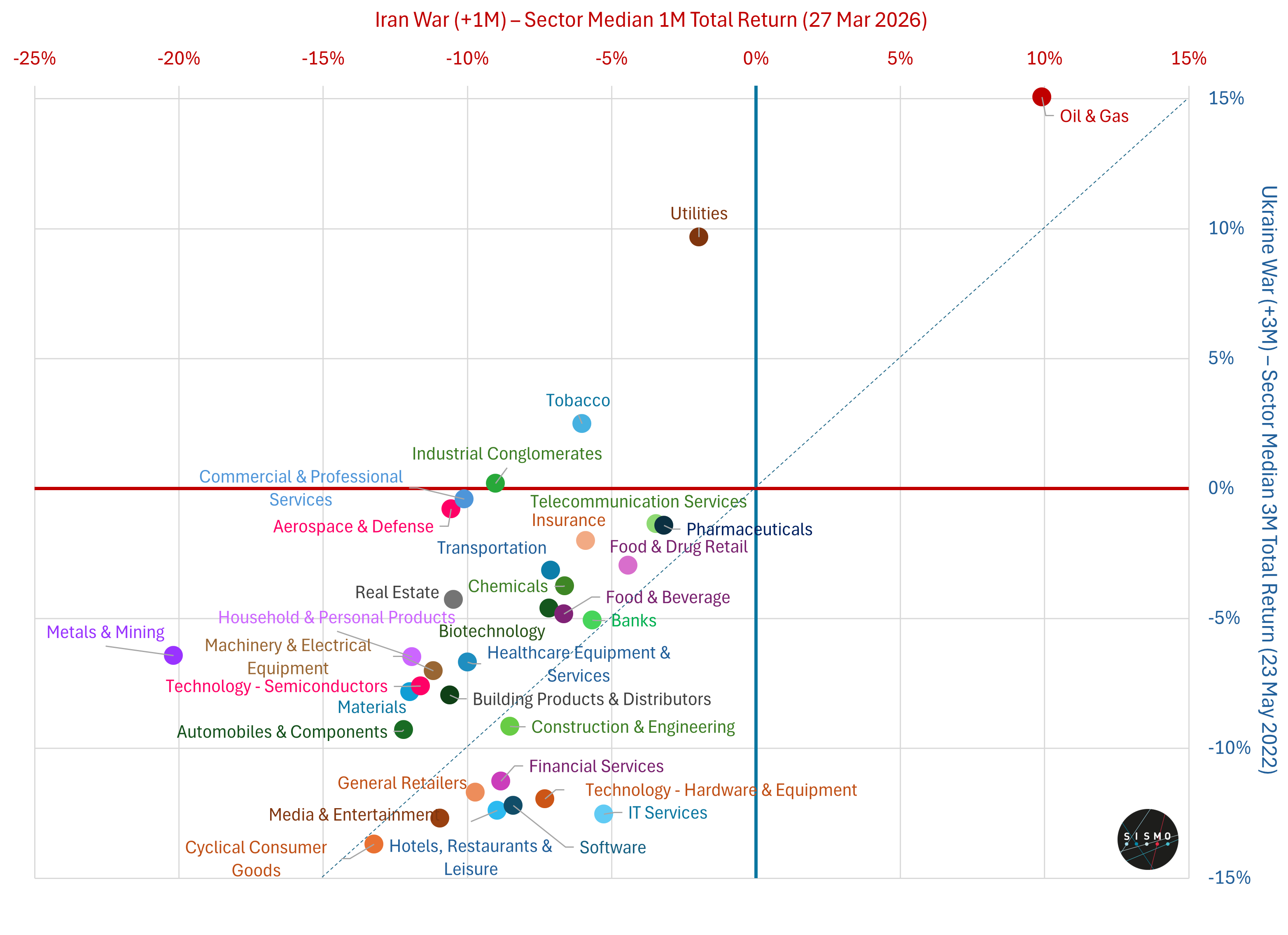 Using Sismo data (MSCI ACWI ETF proxy), comparing 1M after the Iran war (2026) vs 3M after the Ukraine war (2022):
